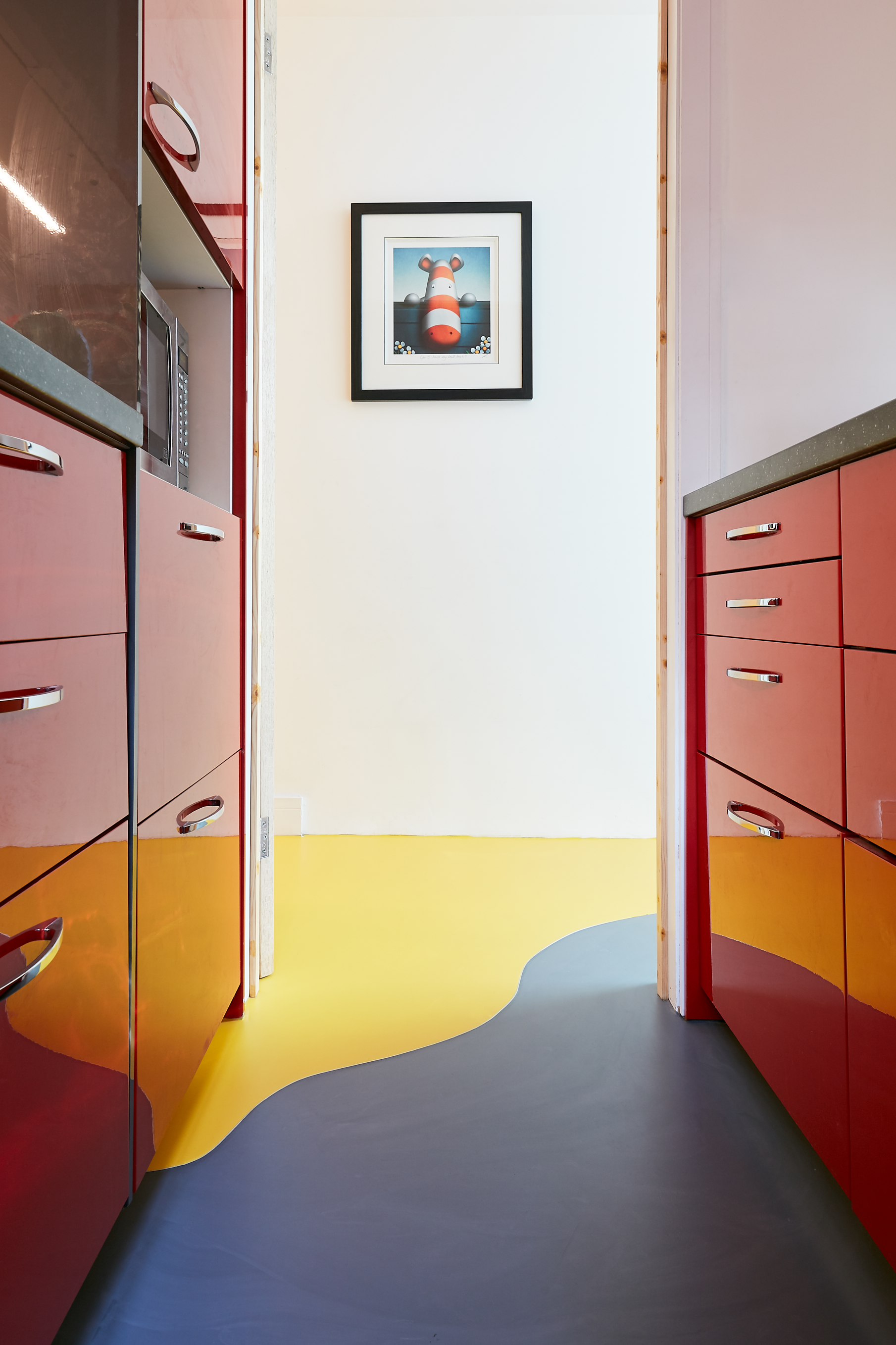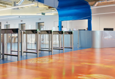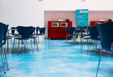 One of our favourite bespoke resin flooring designs that we had the pleasure of installing is at the PlayStation offices in London. Here, custom colours in shades of yellow, orange, and blue, and white flow beautifully through their office. The juxtaposing effect of a bright sunrise effect design with a relaxing sky design make this space so unique and eye-catching. It really is a floor like no other.