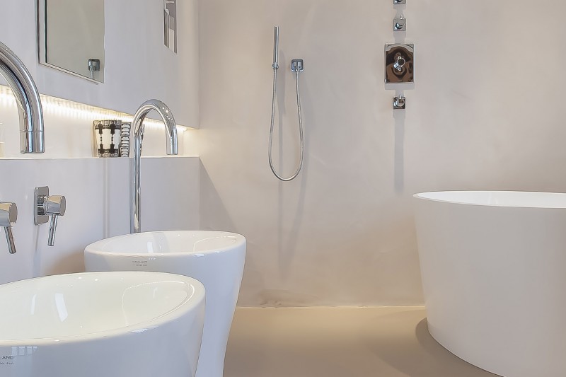 Sphere8 are able to install both poured floors and hand-applied walls, and both materials work in different ways to create a concrete bathroom effect. Our wall finishes are trowelled by hand, which creates movement in the final surface. This texture is reminiscent of concrete and creates a subtle variation in colour. Our floors are universally flat and smooth, but the movement in colour comes from the dual-pigment build-up that is available in any colour. Although our floors and our wall finishes are different textures, they work perfectly together to create a seamless concrete-effect bathrooms. The colours can be carefully selected so as to be almost identical. If you would like to have them the same colour please discuss with your sales consultant, who can advise on this.